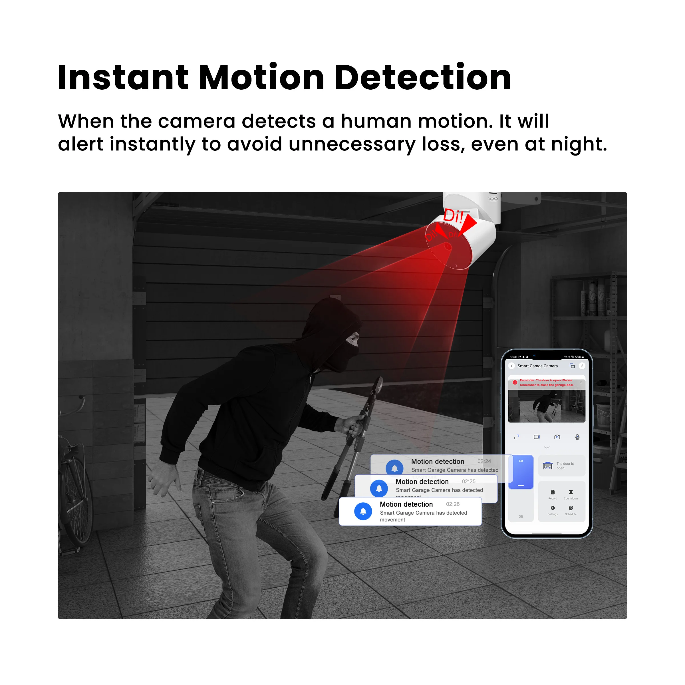 The built-in 1080P camera captures sharp, detailed video of your garage and surroundings. Advanced motion detection sends instant notifications to your phone when movement is detected, ensuring you never miss unusual activity.