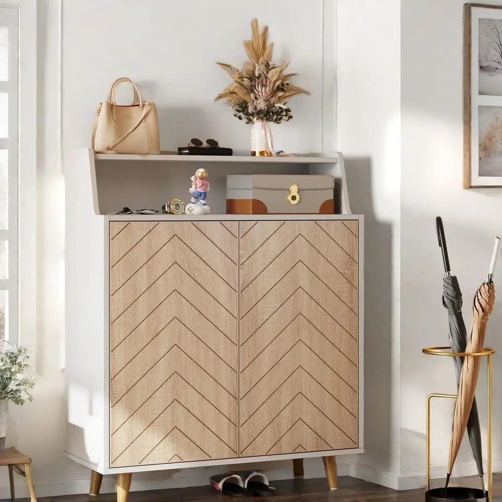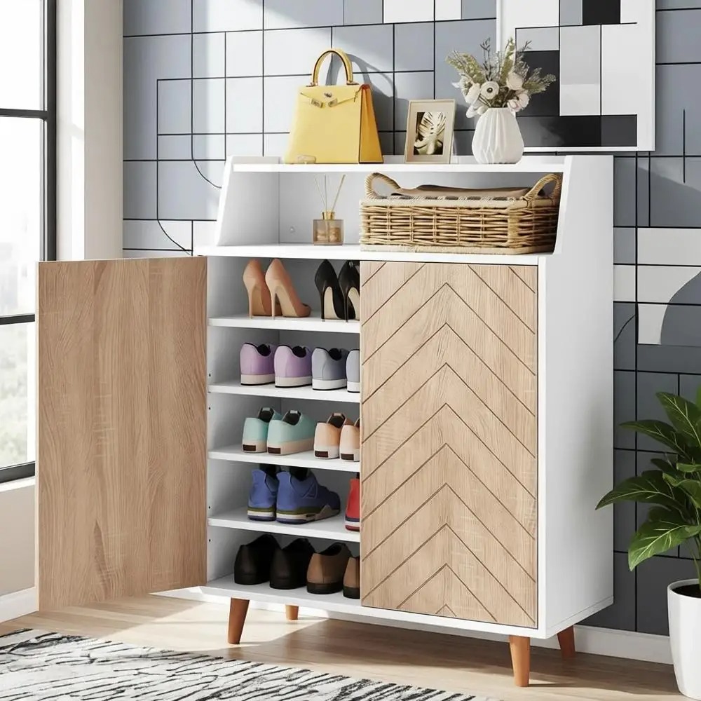 The full-length door conceals shoes and other stored items, helping maintain a minimalist aesthetic. Smooth hinges and magnetic closures make opening and closing effortless and quiet. This feature provides a neat, visually appealing entryway or closet while protecting shoes from dust and debris.