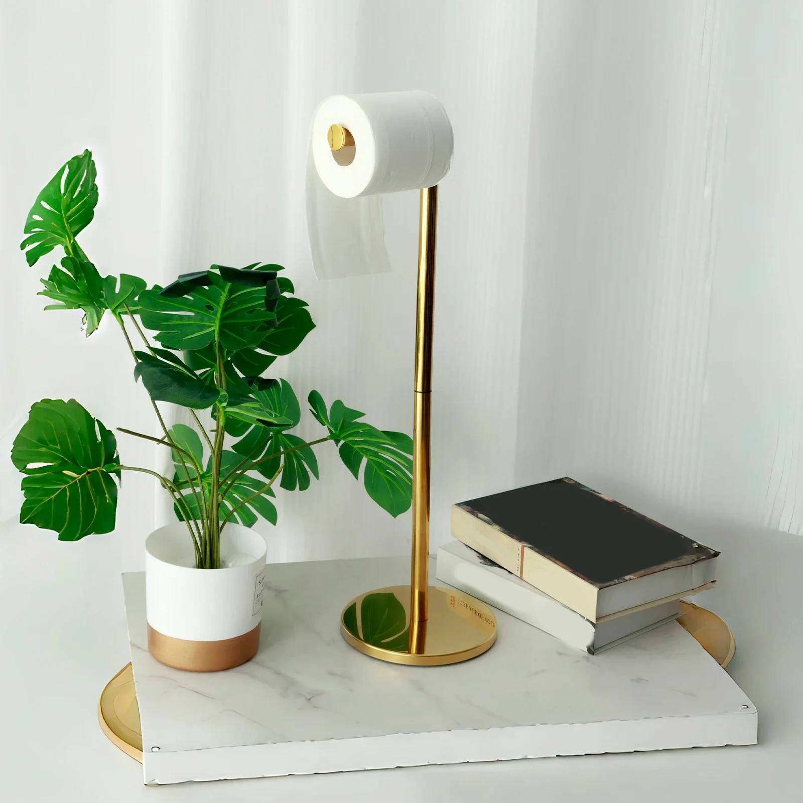 Upgrade your bathroom organization with the Standing Brass Toilet Paper Holder, a stylish and functional freestanding solution. Crafted from durable stainless steel with a brass finish, this holder offers rustproof performance and long-lasting durability. Its freestanding design makes it perfect for homes, apartments, or guest bathrooms without the need for wall installation.